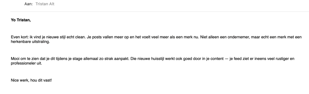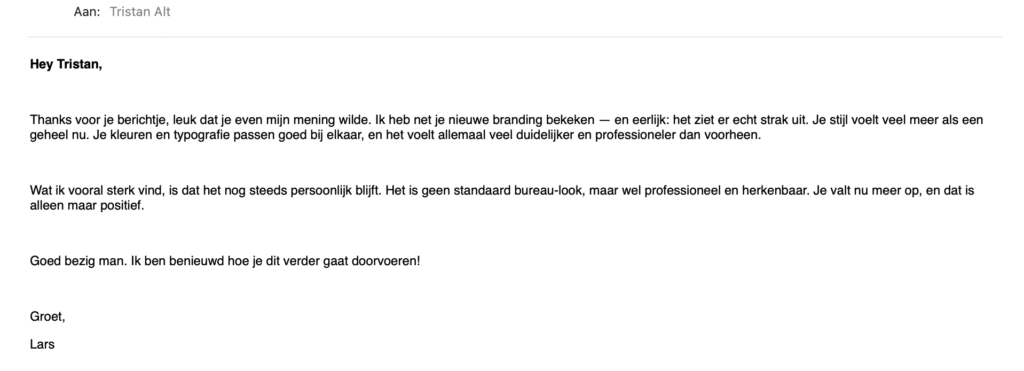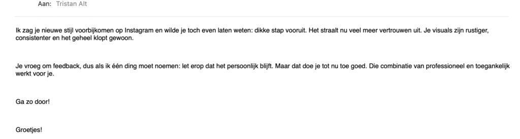 In het begin wuifde ik het weg. “Zo hoort het bij ondernemen”, dacht ik. Maar het bleef hangen. Die opmerkingen kwamen niet uit irritatie, maar uit zorg. Ik ben daardoor anders naar m’n gedrag gaan kijken. Sindsdien heb ik openingstijden ingesteld, en probeer ik bewuster offline te zijn. Niet alleen voor mezelf, maar ook voor de mensen om me heen.