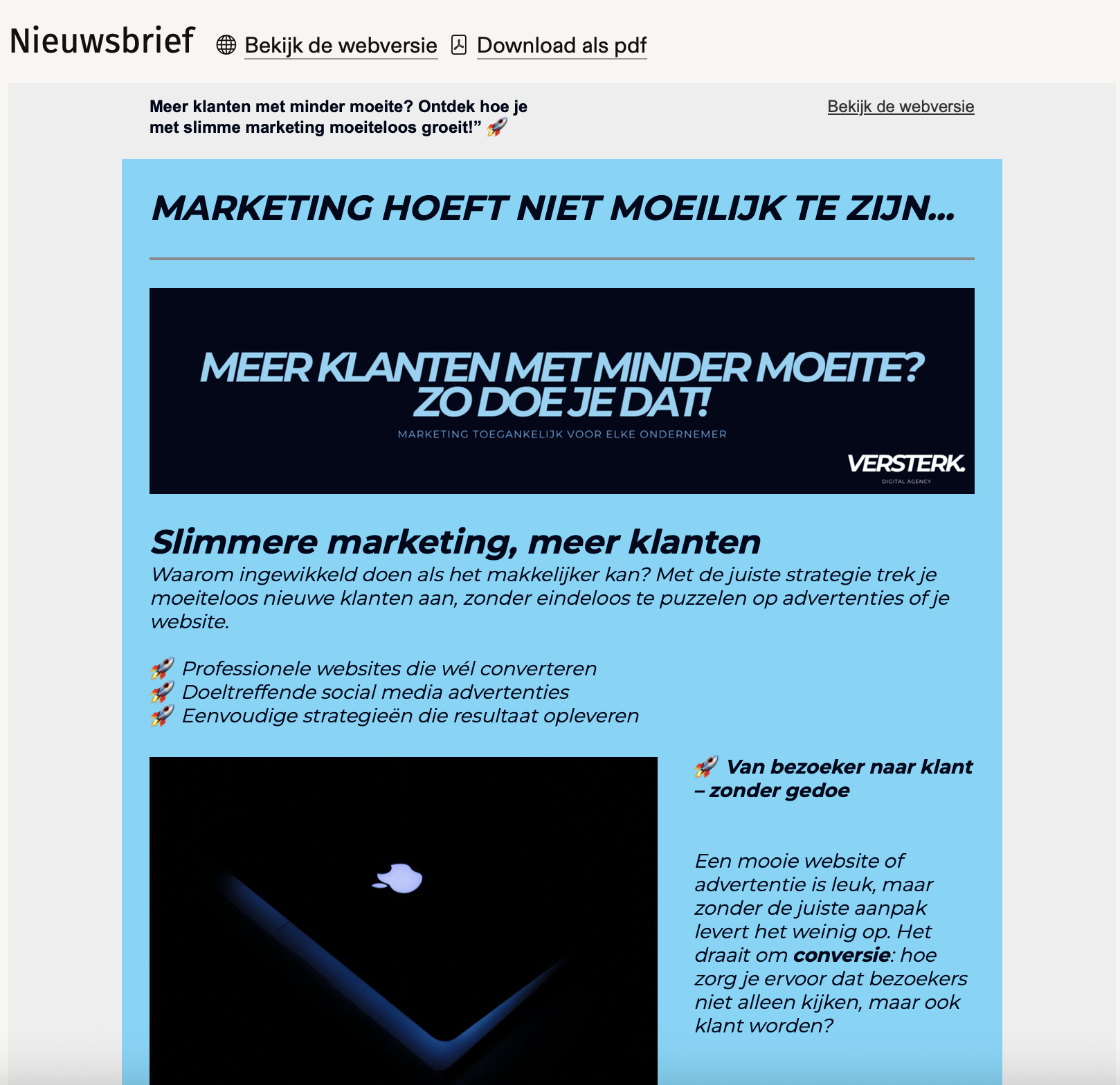 Ik heb een kleine e-maillijst samengesteld van eerdere contacten, netwerkconnecties en geïnteresseerden. Vervolgens heb ik twee mailings verstuurd: – De eerste was gericht op mijn vernieuwde branding en wat ik op dit moment aanbied. – De tweede was specifiek voor social media beheer, met een overzichtelijk aanbod, een deadline en een duidelijke call-to-action. Vanuit deze mails heb ik meerdere reacties gehad en zijn er gesprekken ontstaan die tot klanten hebben geleid. De twee mailings hebben samen gezorgd voor 4 reacties, waarvan 1 heeft geleid tot een betaalde opdracht.